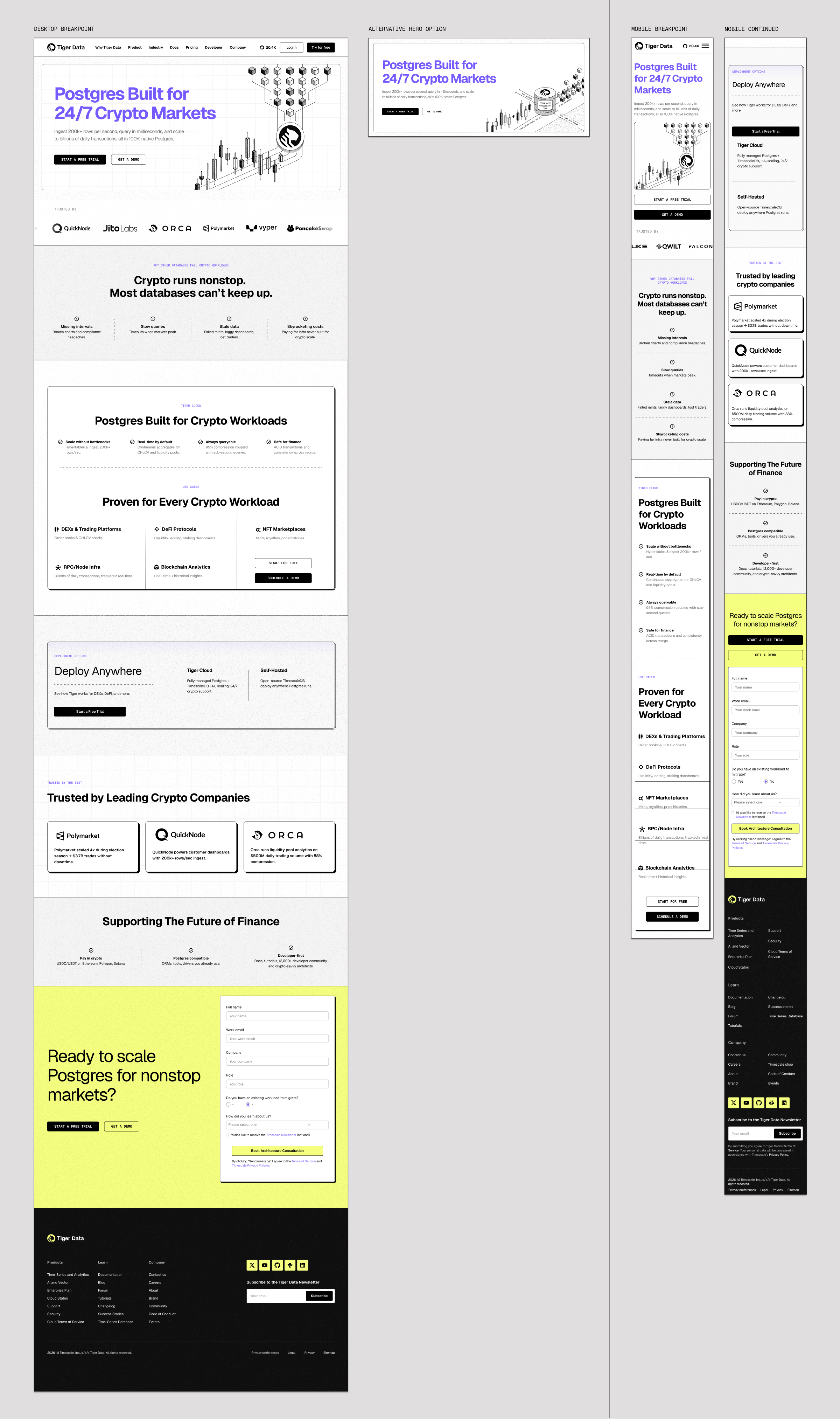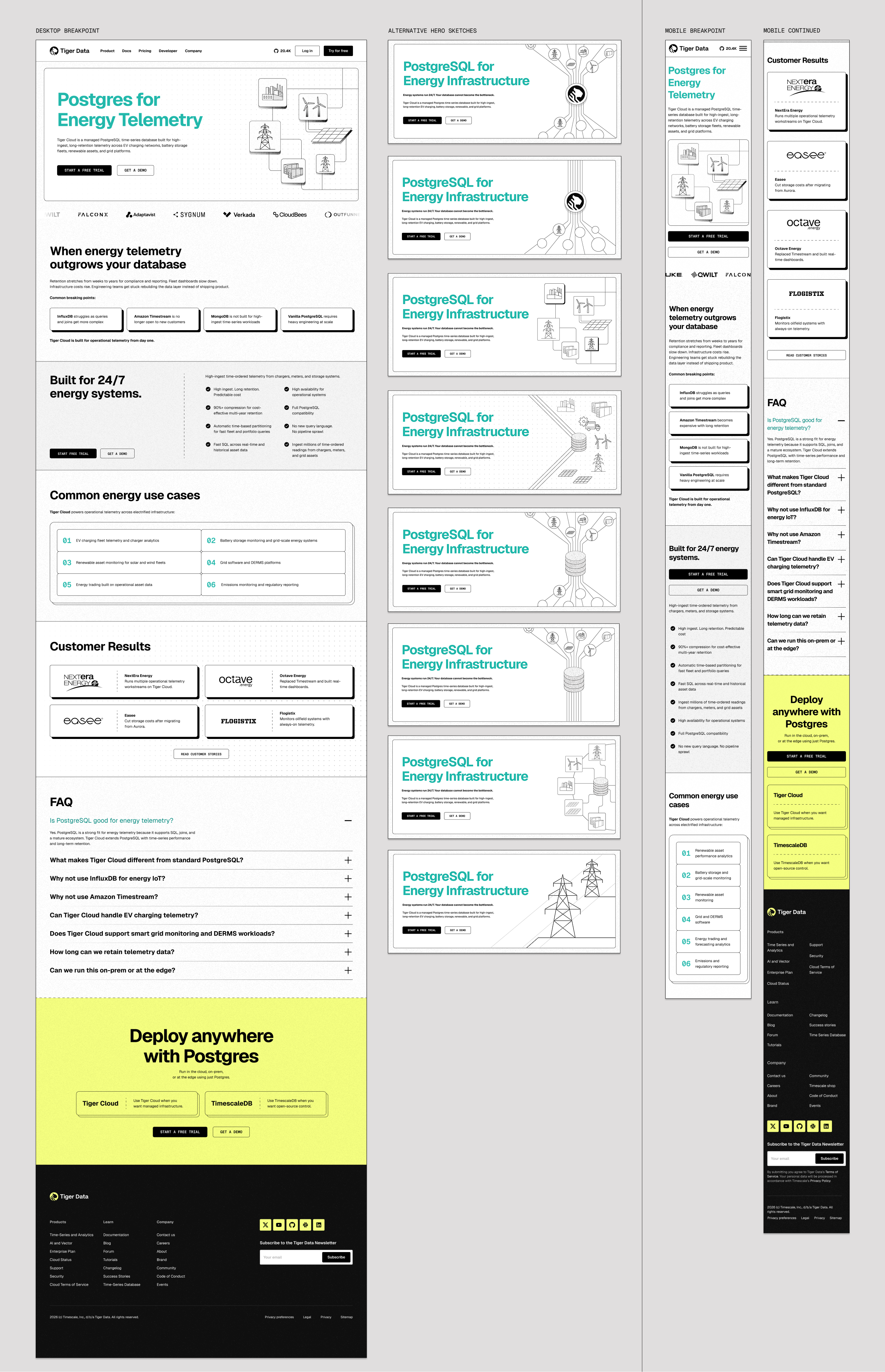 A selection of landing pages I designed or art-directed at Tiger Data. At Tiger Data, my team and I created and managed all of the pages on the website.